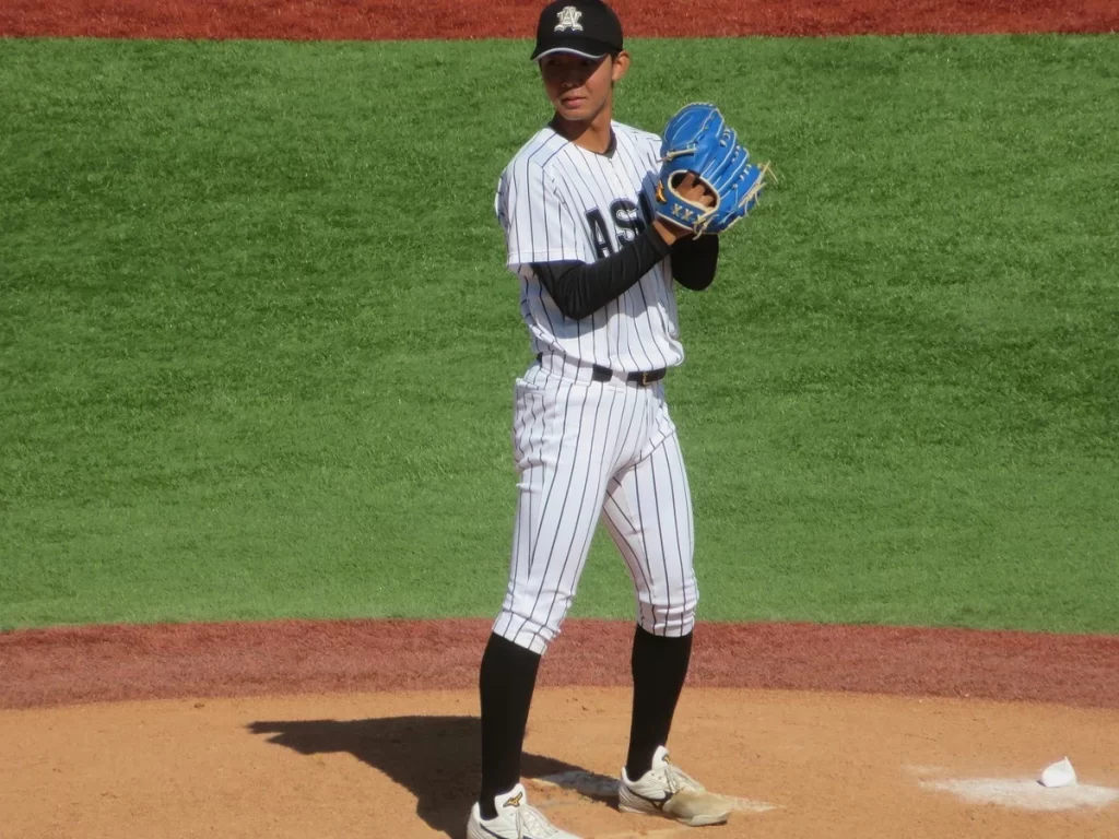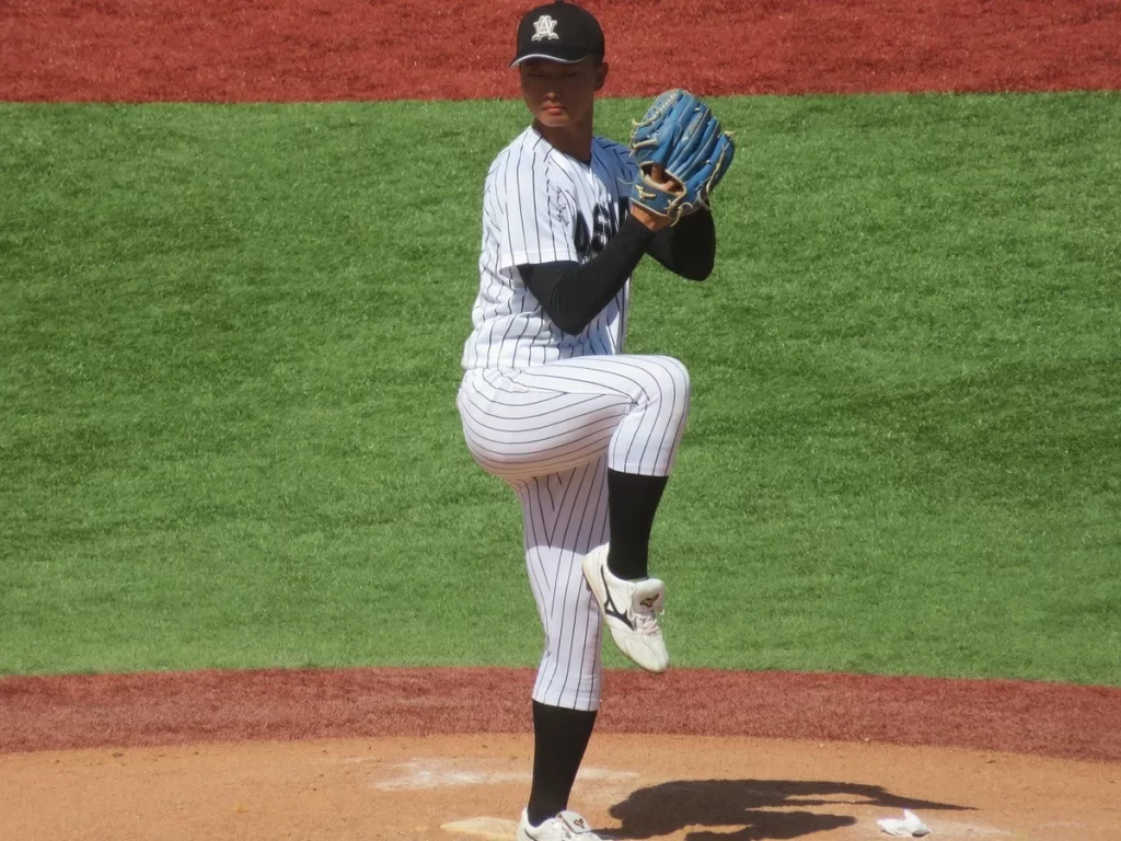 踏み出してからの体重移動が良くしっかりと腕が振れ、ズドンとくる140キロ後半の威力ある直球で打者を押し込んできます。球持ちが良く直球の強さが秀逸で魅力あります。スプリットも落差があり三振が取れます。大学生トップクラスの投手だと思いますし、ドラフト上位候補としてしっかりと結果を残して欲しいですね。